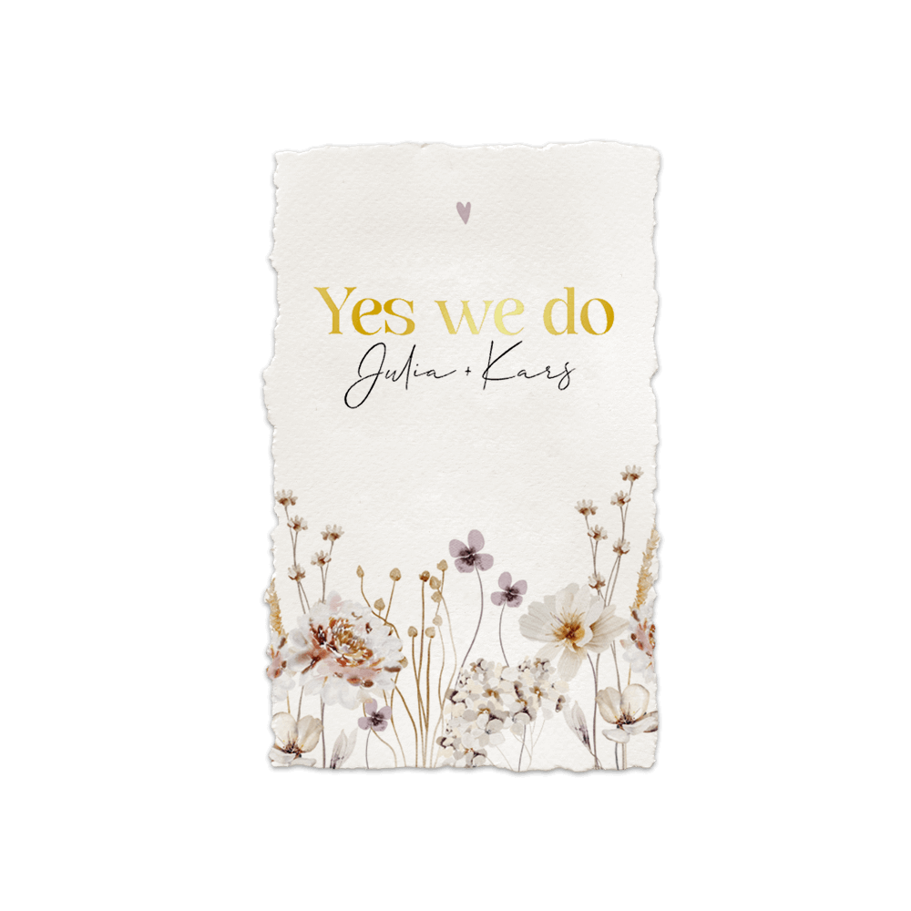 Foliedruk trouwkaart met handgeschepte papieren look en bloemen DIY