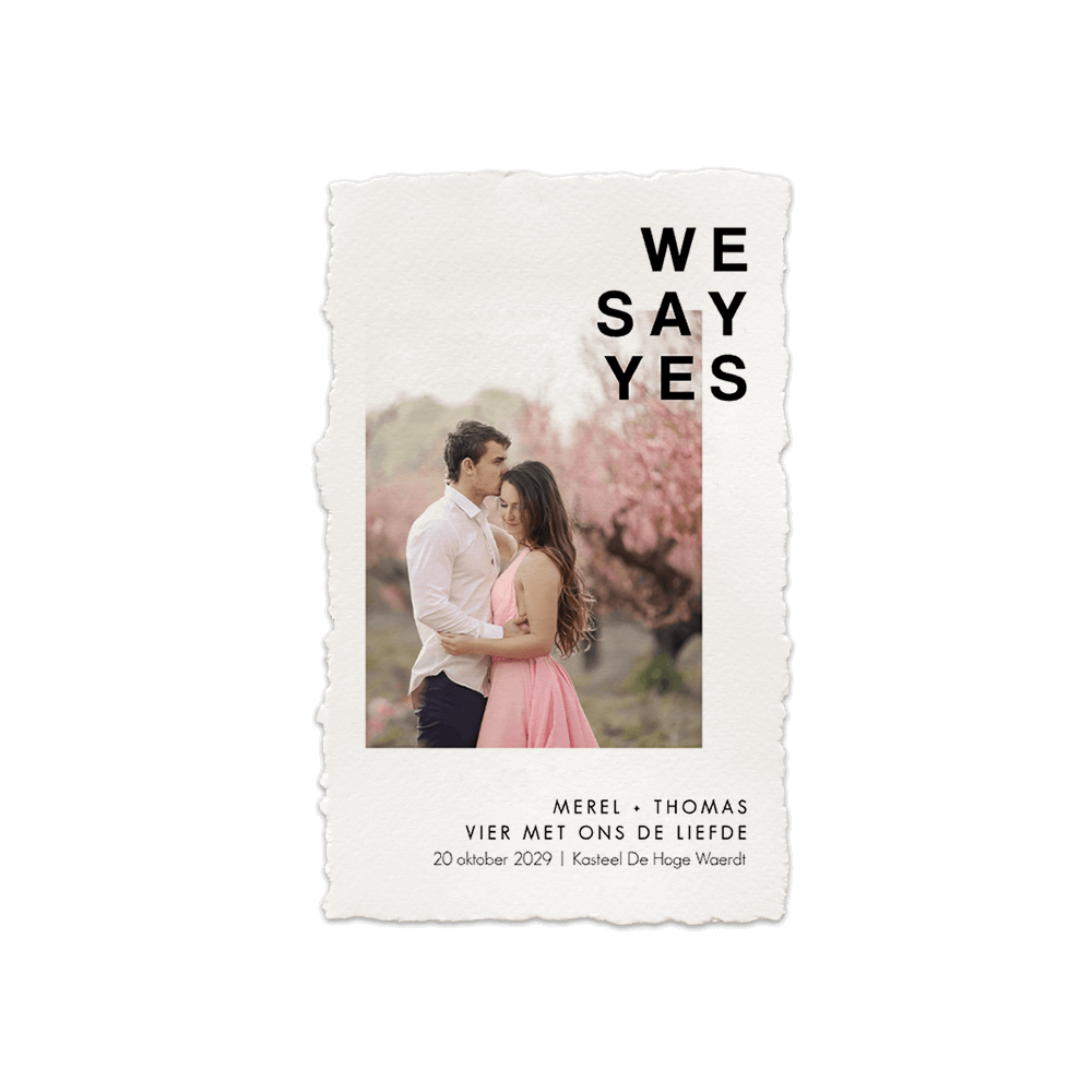 Een basic trouwkaart in een handgeschepte papieren look. Deze huwelijksuitnodiging heeft een clean design met eigen foto. Pas de teksten en kleuren van de kaart gemakkelijk aan in onze online editor. Het formaat van deze kaart is 11 x 17 cm.