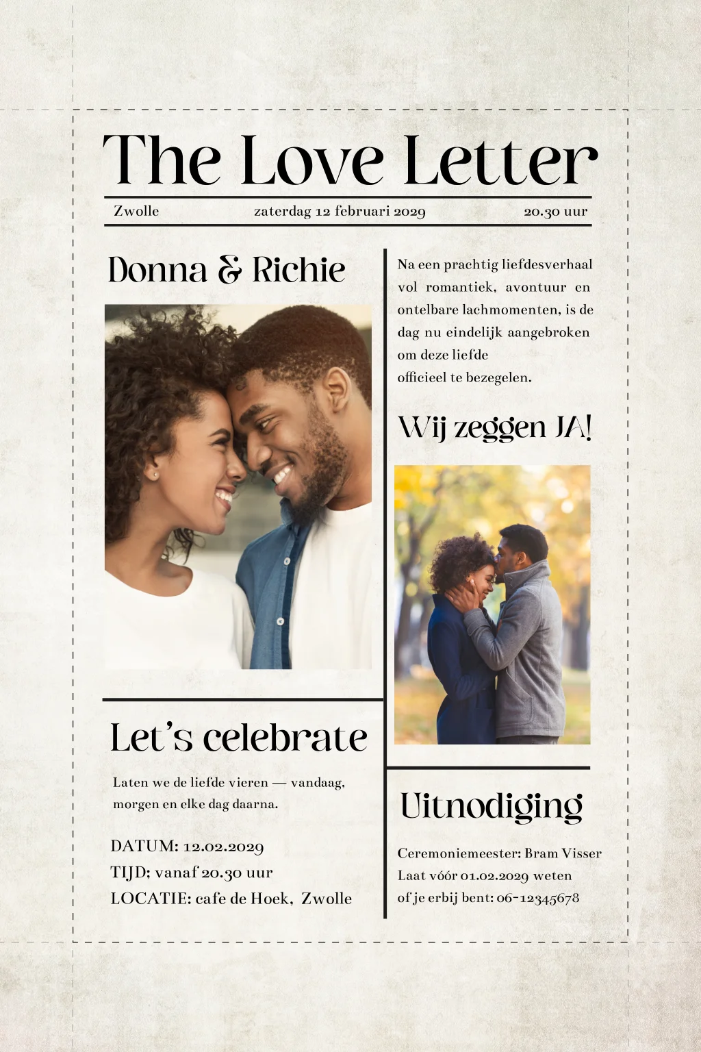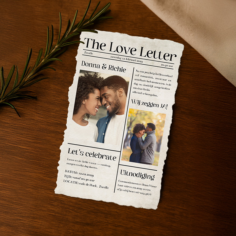 Op zoek naar een grappige en originele trouwkaart die zeker zal opvallen bij je gasten? Bestel dan deze DIY handgeschepte trouwkaart in de stijl van een krant, the love letter. Zet eigen foto's op de huwelijksuitnodiging en maak de uitnodiging zo helemaal persoonlijk en in jullie eigen stijl. Pas kleuren en lettertypes in onze online editor aan voor jullie persoonlijke touch. Deze kaart heeft het formaat 11 x 17 cm.