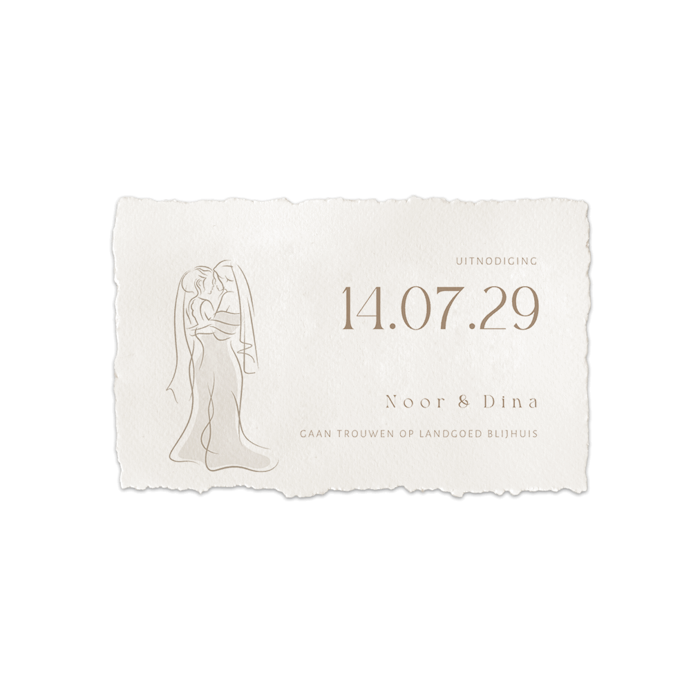 Prachtige en originele trouwkaart met een lesbisch stel. Deze trouwkaart heeft een luxe uitstraling door de handgeschepte papierlook. Op de trouwkaart staat een rustige lijntekening van twee vrouwen als vrouwelijk bruidspaar. Pas de teksten en kleuren van de kaart gemakkelijk aan in onze online editor. Het formaat van deze kaart is 11 x 17 cm.