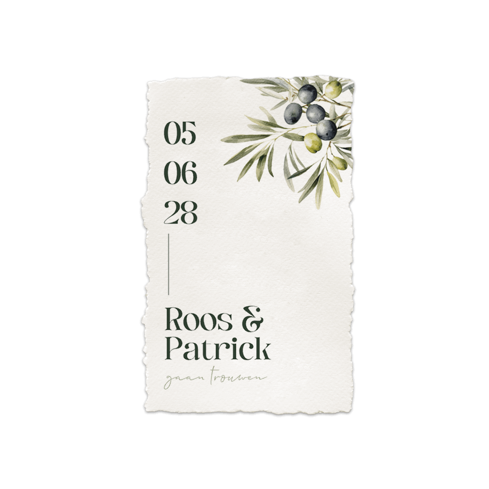 Een prachtige mediterraanse trouwkaart. Deze trouwkaart kun je zelf voorzien van een handgeschepte papieren look door middel van het liniaaltje. Op deze kaart zie je een olijventak geïllustreerd, de trouwdatum en de namen van het bruidspaar staan. Deze kaart heeft het formaat 11 x 17 cm. Pas naar eigen wens aan in onze online editor en kies voor de olijfgroene envelop om de uitnodiging helemaal af te maken.