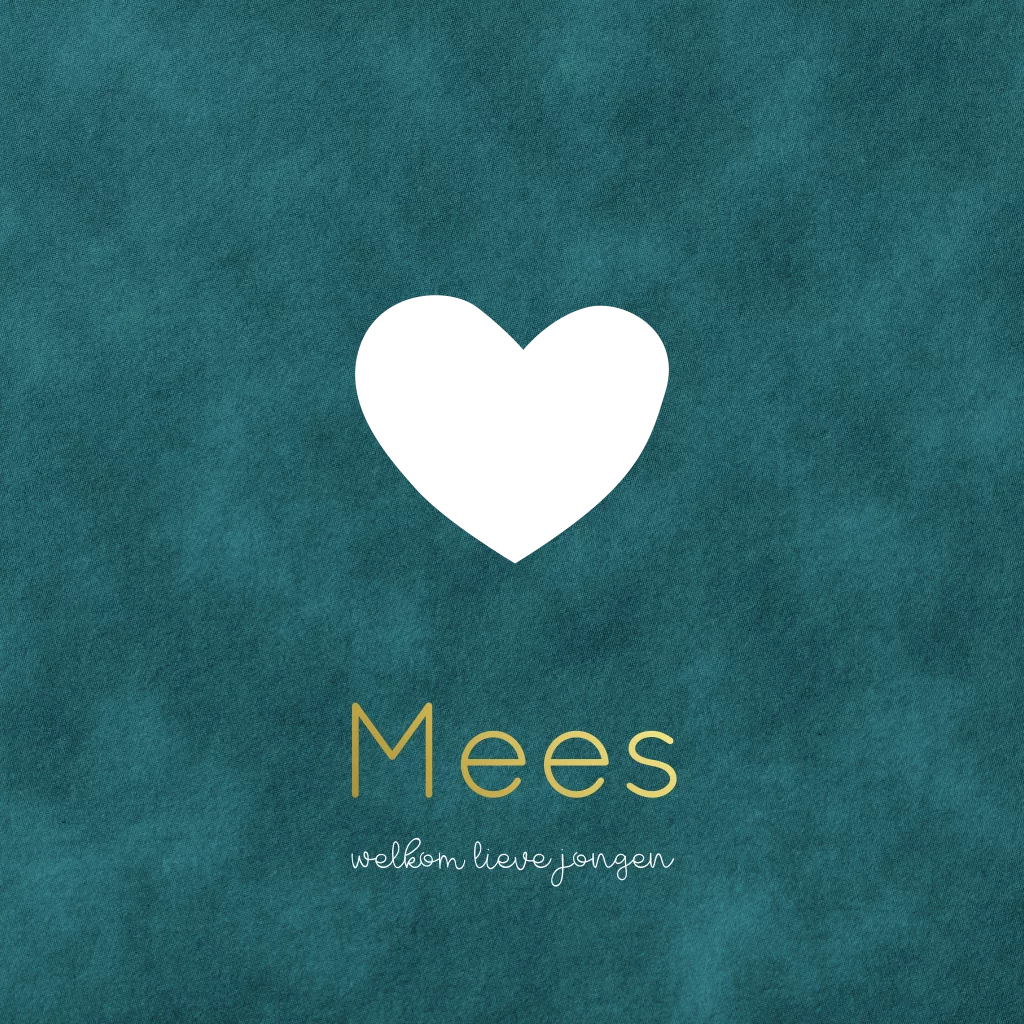 Uniek en stijlvol unisex geboortekaartje voor een jongen met uitsnede en goudfolie. Dit kaartje Mees is gebaseerd op het geboortekaartje van Anne Vedder en heeft een uitsnede van een hartje wat een mooi doorkijkje geeft naar de binnenkant van de kaart. Door het doorkijkje zie je op de binnenzijde een vingerafdruk hartje van twee fingerprints die samen komen. De achtergrond heeft een zachte blauwe suède softlook. De goudfolie geeft een luxe afwerking aan dit bijzondere fingerprint geboortekaartje. Pas de kleuren, teksten en lettertypes gemakkelijk aan in de editor. Hulp nodig? Wij helpen je graag!