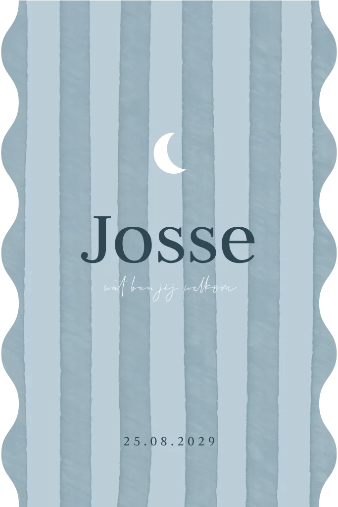 Dit prachtige geboortekaartje is een unieke keuze voor de aankondiging van de geboorte van jullie zoon. Dit geboortekaartje Josse heeft een aparte vorm, namelijk een uitsnede van golven met een gestreepte blauwe achtergrond. Het maantje wordt ook uitgesneden. Pas de teksten, kleuren en lettertypes eenvoudig aan in de editor en maak het kaartje af met een donkerblauwe envelopkleur.