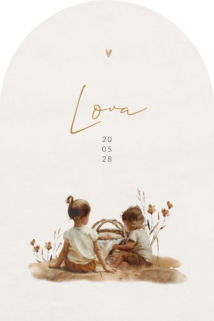 Prachtig geïllustreerd geboortekaartje in een boogvorm voor een derde kindje, een zusje! Op dit geboortekaartje Lova zie je grote zus en grote broer bij de mand van hun zusje staan. De schildering is lief en zou ook perfect passen als je op zoek bent naar een vintagelook geboortekaartje. Bestel dit prachtige geboortekaartje en deel jullie vreugdevolle nieuws op een unieke en persoonlijke manier.