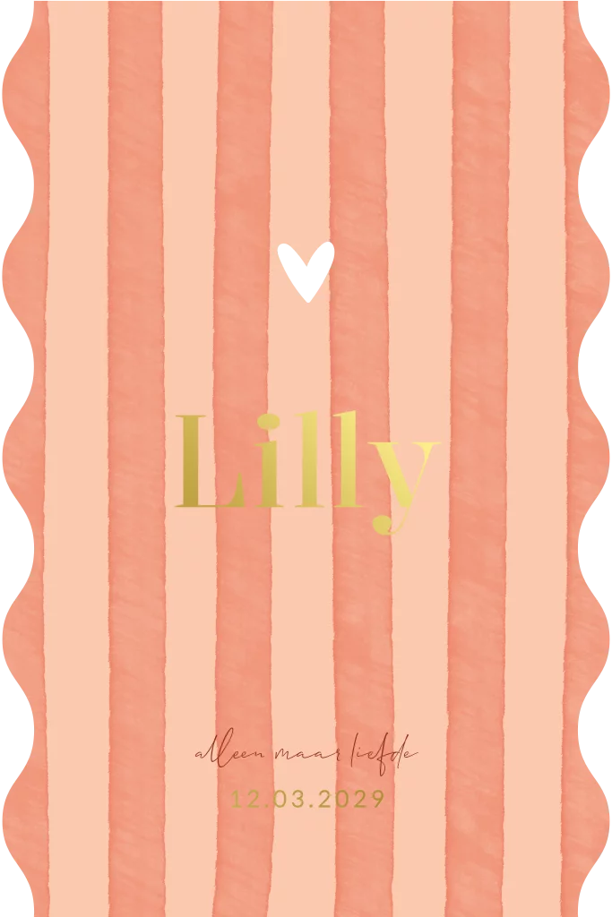 Uniek en apart geboortekaartje, voorzien van alle luxe! Dit aparte vormen kaartje Lilly heeft een uitsnede van golven, dubbelzijdig foliedruk en een uitgesneden hartje. Het koraal en zalmkleurige streeppatroon geeft een vrolijke uitstraling. De naam wordt in prachtig goudfolie gedrukt. Pas de teksten, kleuren en lettertypes eenvoudig aan in de editor.