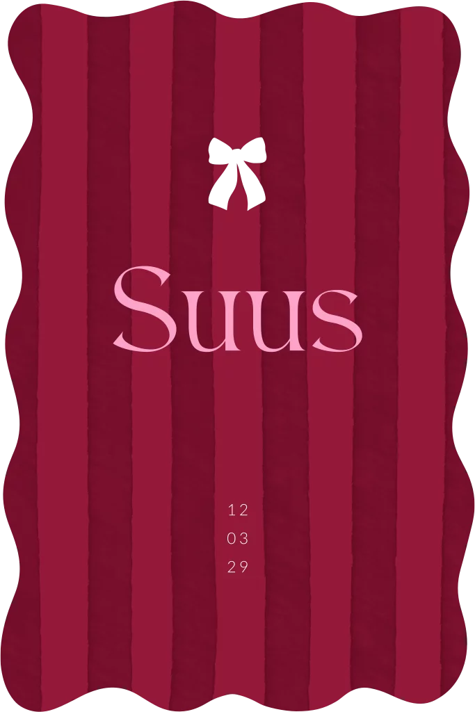 Dit prachtige geboortekaartje is een unieke keuze voor de aankondiging van de geboorte van jullie dochter. Dit geboortekaartje Suus heeft een aparte vorm, namelijk een uitsnede van golven met een gestreepte rood roze achtergrond. Het strikje wordt ook uitgesneden. Pas de teksten, kleuren en lettertypes eenvoudig aan in de editor en maak het kaartje af met een lichtroze envelopkleur.
