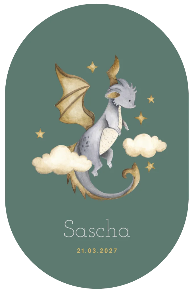 Genderneutraal geboortekaartje voor een zoon of dochter in een aparte vorm. Dit babykaartje Sascha is gesneden in een ovale vorm. Op dit geboortekaartje zie je een illustratie van een vliegend draakje tussen de sterren en wolken. De stoere kleuren in combinatie met de sprookjesachtige illustratie van een lief draakje maken dit kaartje geschikt voor zowel een jongen als meisje. De kleuren en lettertypes kun je aanpassen in de editor. Hulp nodig? We helpen je graag.