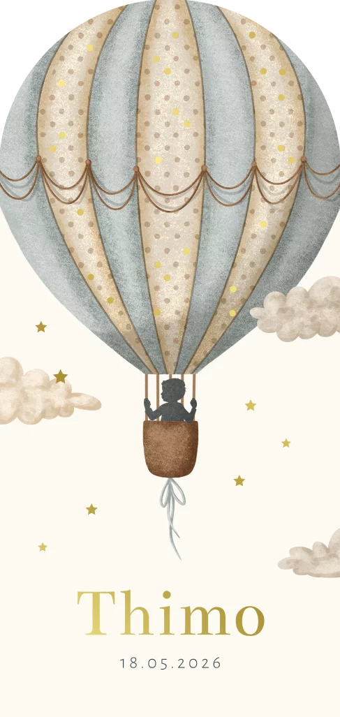 Luxe geboortekaartje in aparte vorm met foliedruk. Dit jongenskaartje Thimo wordt gesneden in de vorm van een luchtballon. Dat maakt dit kaartje, samen met de foliedruk, extra uniek en origineel. In de mand van de ballon een silhouet van een jongen op avontuur met op de achtergrond wolken en sterren. Pas de kleuren, teksten en foliedruk gemakkelijk aan in de editor. Hulp nodig? Wij helpen je graag!