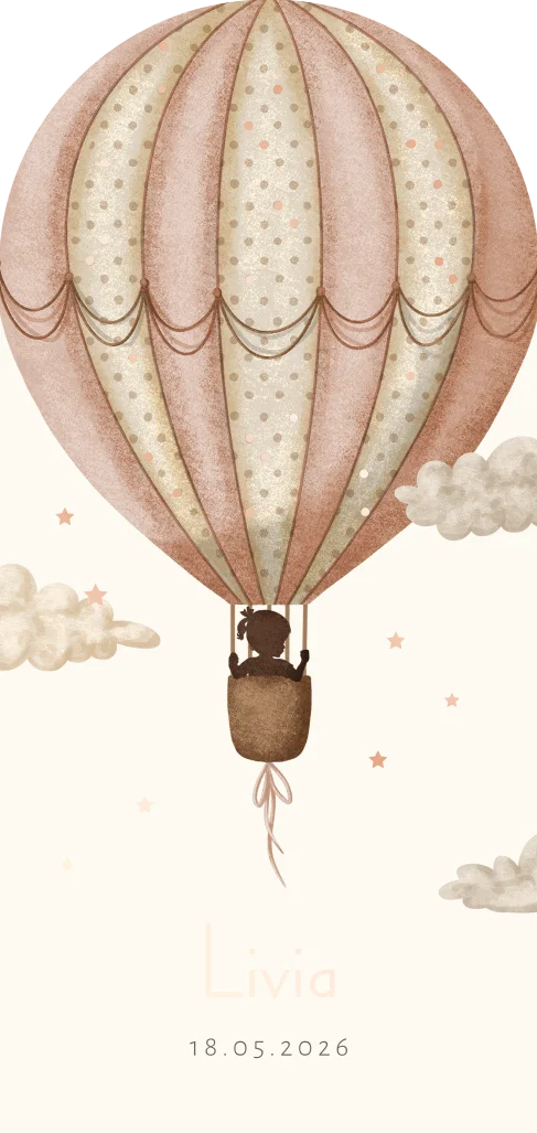 Wanneer je op zoek bent naar een uniek geboortekaartje, is deze kaart in aparte vorm met glanzend roségoud folie perfect. Dit babykaartje Livia wordt in de vorm van een luchtballon gesneden en heeft sterren en wolken. Dit geboortekaartje is uniek en origineel, en zal zeker opvallen tussen alle andere geboortekaartjes.