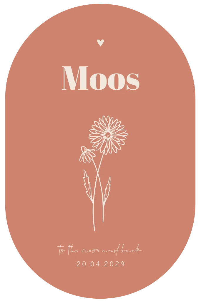 Geboortekaartje voor een dochter in een aparte vorm. Het perfecte kaartje voor een meisje die in april wordt geboren. Dit kaartje Moos wordt gesneden in een ovalen vorm en heeft een mooie geboortebloem, een madeliefje, op de voorkant staan. Deze bloem past bij de maand april maar kan natuurlijk ook op zichzelf gebruikt worden. De koraal roze achtergrond met beige letters maken dit een vrolijk maar toch rustig en stijlvol kaartje.