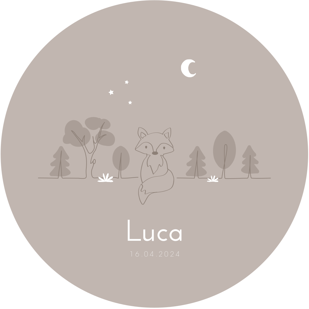 Unisex geboortekaartje voor een meisje of jongen in de vorm van een cirkel. Op dit ronde kaartje Luca een outline van een lief vosje in het bos met bomen, maan en sterren. Dit geboortekaartje past helemaal bij een herfst of winter baby. Pas de teksten, lettertypes en kleuren eenvoudig aan in de editor.