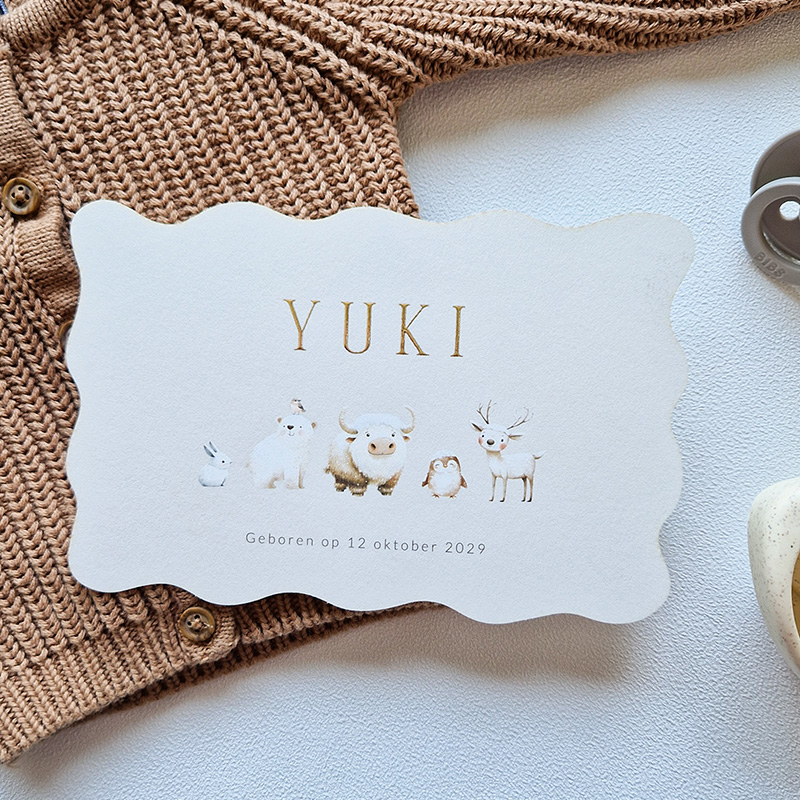 Een geboortekaartje met een prachtige organische vorm voor een jongen. Op dit geboortekaartje Yuki zie je verschillende dieren in winterse sferen. Een konijntje, ijsbeer, bizon, pinguïn, vogeltje en een hert. Het goudfolie zorgt voor een luxe sfeer op dit geboortekaartje voor jullie zoon. De bijpassende sluitzegel en de metallic beige envelopkleur maken dit geboortekaartje helemaal af.