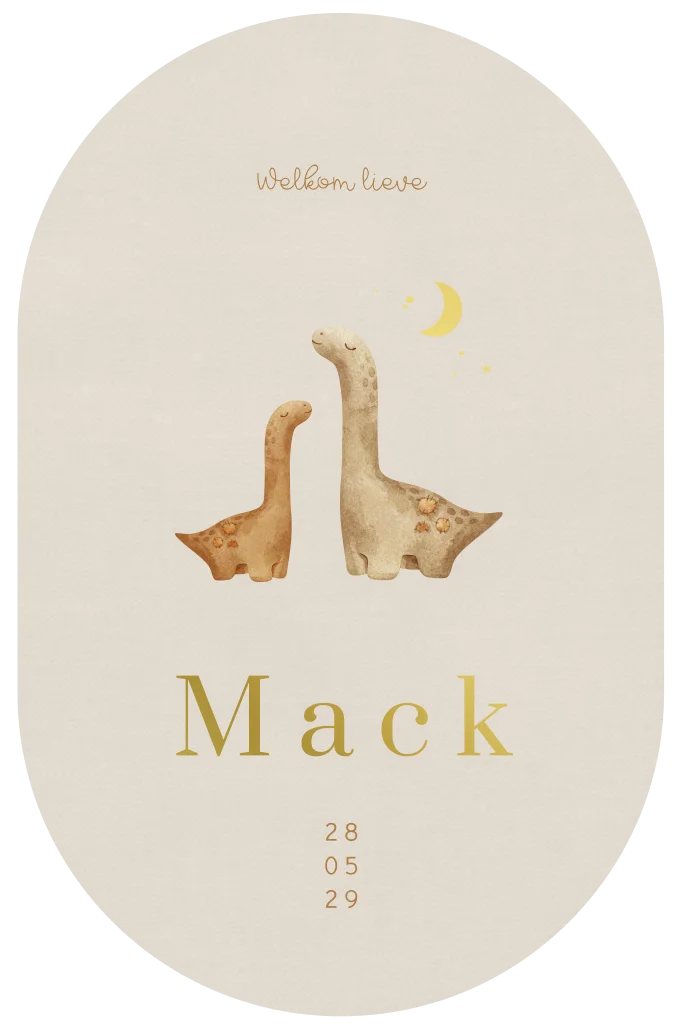 Lief dino geboortekaartje met foliedruk en in originele vorm, een ovalen vorm. Op dit jongenskaartje Mack zie je twee geïllustreerde aquarel dinosaurussen met een maantje en sterren. De gouden elementen en naam van jullie zoon worden gedrukt in écht goudfolie. Dat geeft een luxe uitstraling aan dit rustige geboortekaartje. De aparte vorm geeft daarnaast een speels effect aan dit originele geboortekaartje.