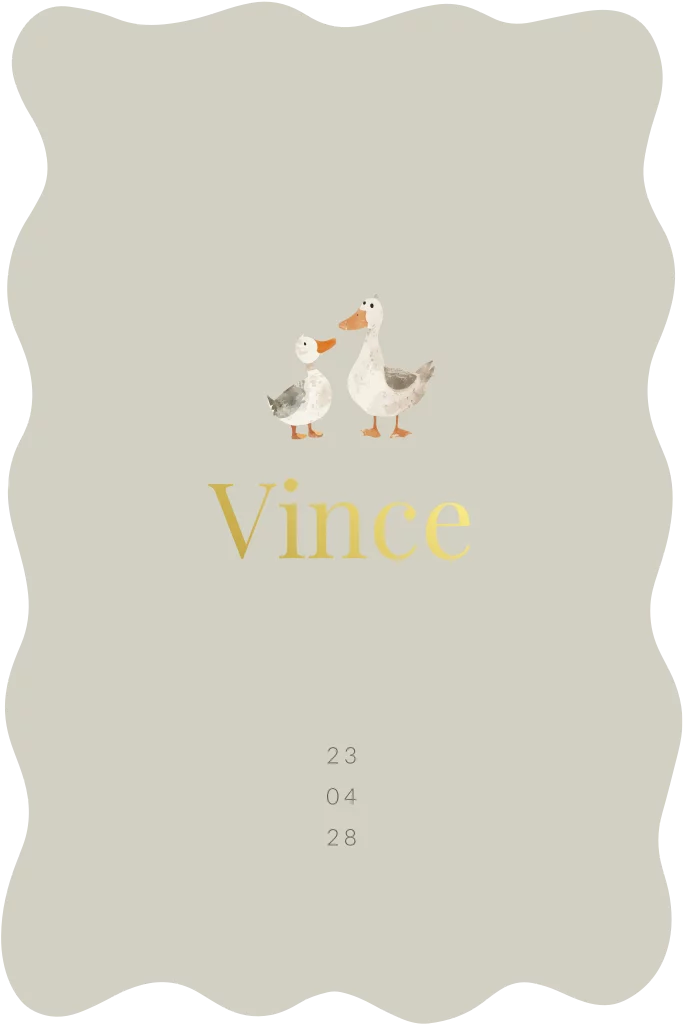 Vier de komst van jullie zoon met een uniek geboortekaartje in een aparte vorm met foliedruk. Dit luxe kaartje Vince is voorzien van prachtige foliedetails en heeft een originele organische vorm van golven waardoor het kaartje direct opvalt. De aquarel eend geeft dit geboortekaartje een lieve en minimalistische uitstraling. Een eend of gans op je uitgekozen geboortekaartje is helemaal leuk! Pas de teksten, lettertypes en kleuren eenvoudig aan in de editor. Hulp nodig bij het ontwerpen? Neem contact met ons op!
