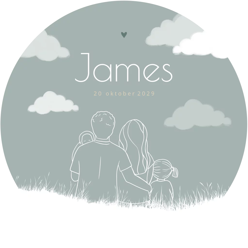 Dit unieke getekende geboortekaartje voor een jongen is bijzonder vanwege de aparte ronde vorm. Op dit geboortekaartje James zie je een lijntekening van een leuk gezin: papa, mama, grote zus en de baby. Op de achtergrond zie je een mooie blauwe lucht met wolken. Kleuren, teksten en lettertypes pas je eenvoudig aan in onze editor.