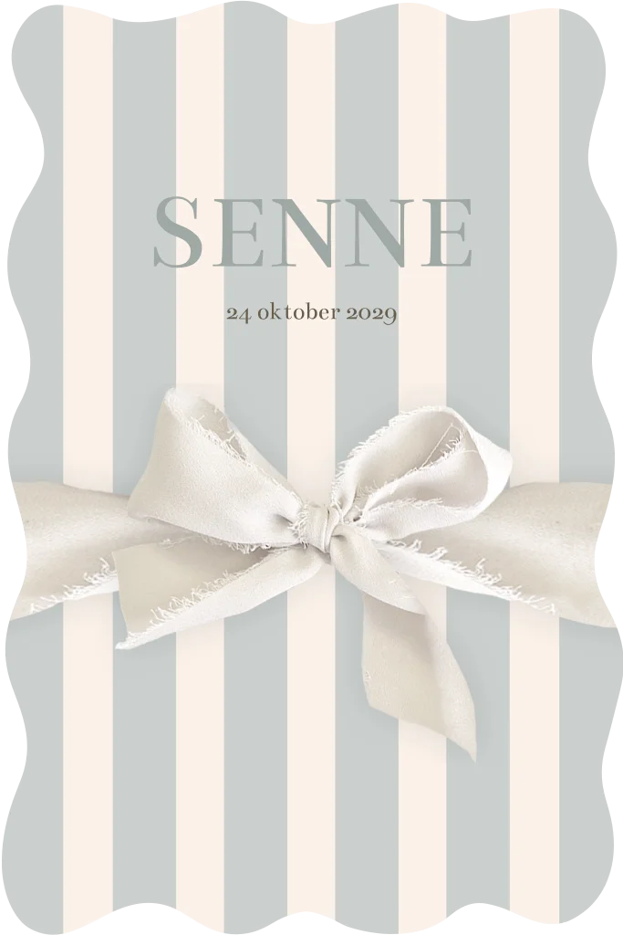 Uniek en origineel geboortekaartje voor een jongen. Dit geboortekaartje Senne is gebaseerd op het geboortekaartje van Sol Rae van Kae Sutherland. Het kaartje heeft een zacht kleurenpalet van blauw met wit. De golvende rand en het zijden chiffon lint maken dit een bijzonder en uniek kaartje dat zeker zal uitblinken. Pas de teksten, kleuren en lettertypes eenvoudig aan in de editor.