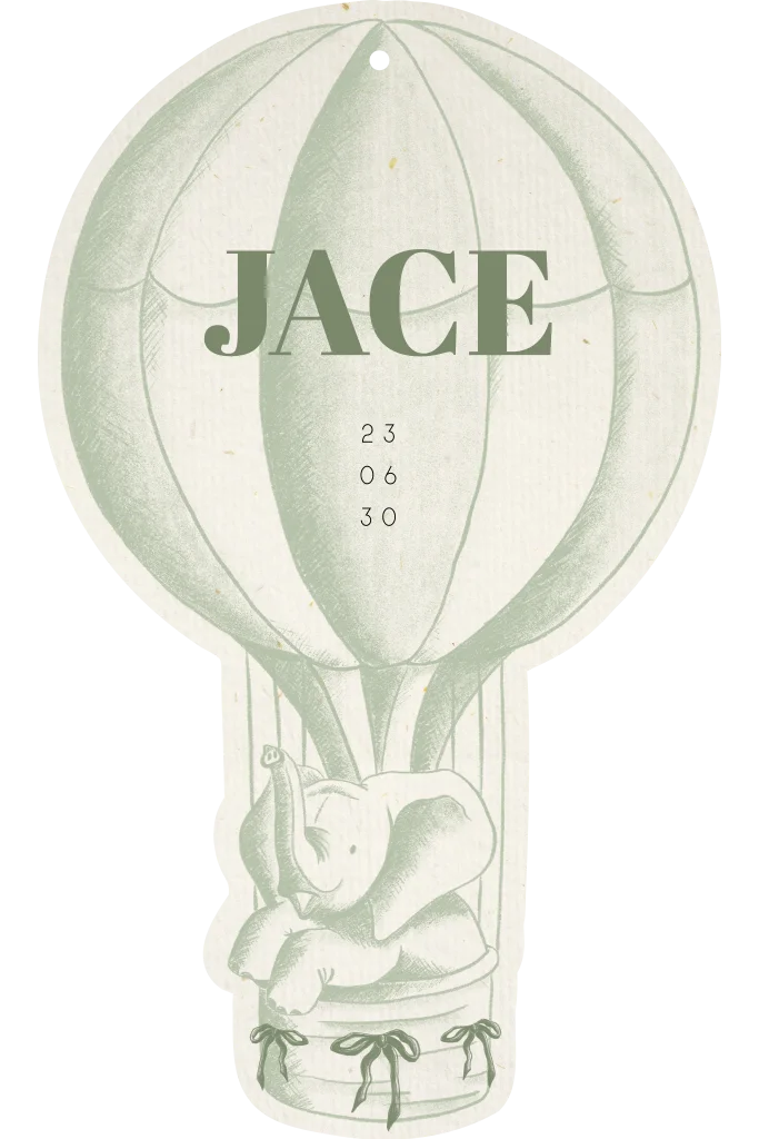 Een lief en uniek geboortekaartje voor een jongen. Dit geboortekaartje heeft een origineel ontwerp, namelijk in de vorm van een luchtballon. Extra leuk is dat je het geboortekaartje met een lint kunt ophangen. Zo zweeft het geboortekaartje echt! In de luchtballon zit een schattig olifantje. Dit geboortekaartje is illustratief getekend in zachte groene kleuren. Een opvallend geboortekaartje voor een bijzonder moment.