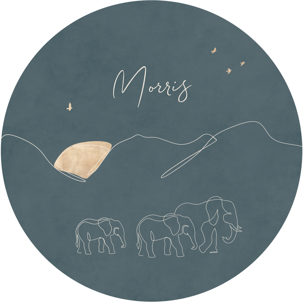 Geboortekaartje voor een jongen in een aparte vorm. Deze babykaart is gesneden in de vorm van een cirkel. Op dit ronde kaartje Morris staan olifantjes als oneline illustratie. Op de achtergrond zijn bergen in oneline getekend.