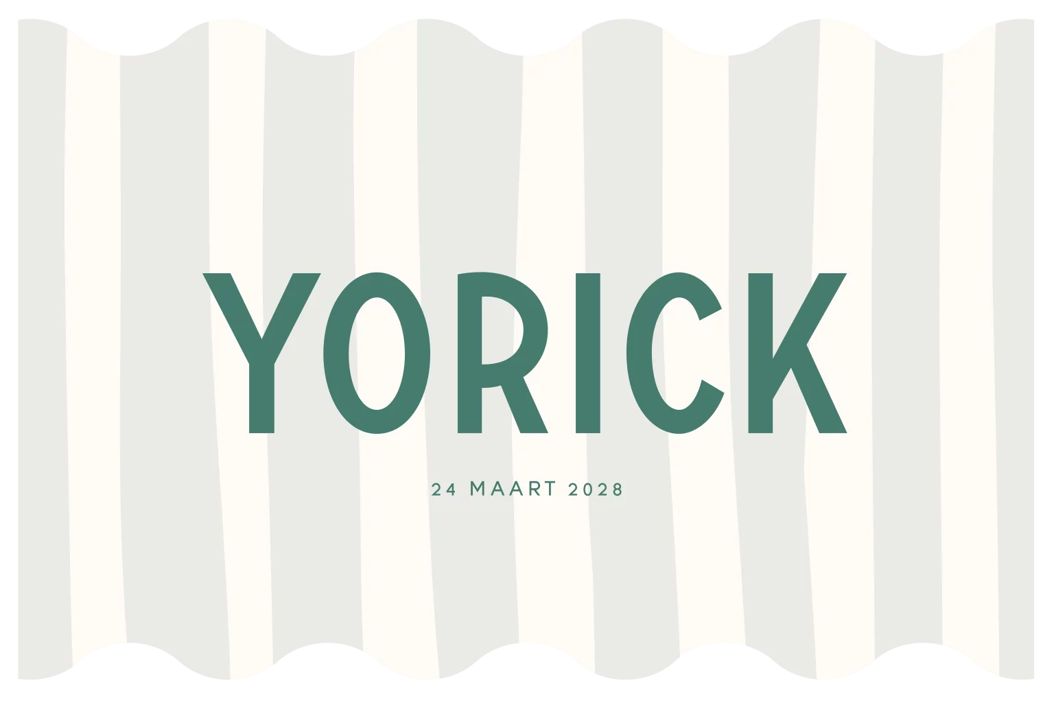 Dit geboortekaartje Yorick is een unieke keuze voor ouders die op zoek zijn naar een bijzonder geboortekaartje voor hun zoontje. De kaart heeft een aparte vorm met boven- en onderaan de kaart een golvende rand. Verder is het design rustig met strepen en de naam van jullie zoon. Pas dit geboortekaartje voor een jongen naar eigen wens aan in de editor.