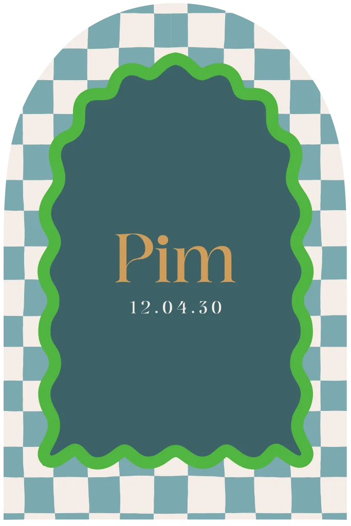 Origineel en uniek geboortekaartje voor een jongen. Dit geboortekaartje Pim heeft een eclectic blauw met wit blokpatroon en een golvend kader. Een opvallend en vrolijk boho eclectic geboortekaartje voor een zoon. Alles is geheel naar eigen wens aan te passen in de editor. Hulp nodig? Ons team staat voor je klaar.