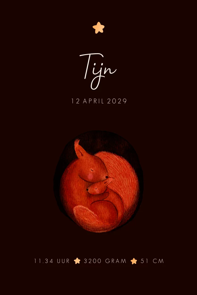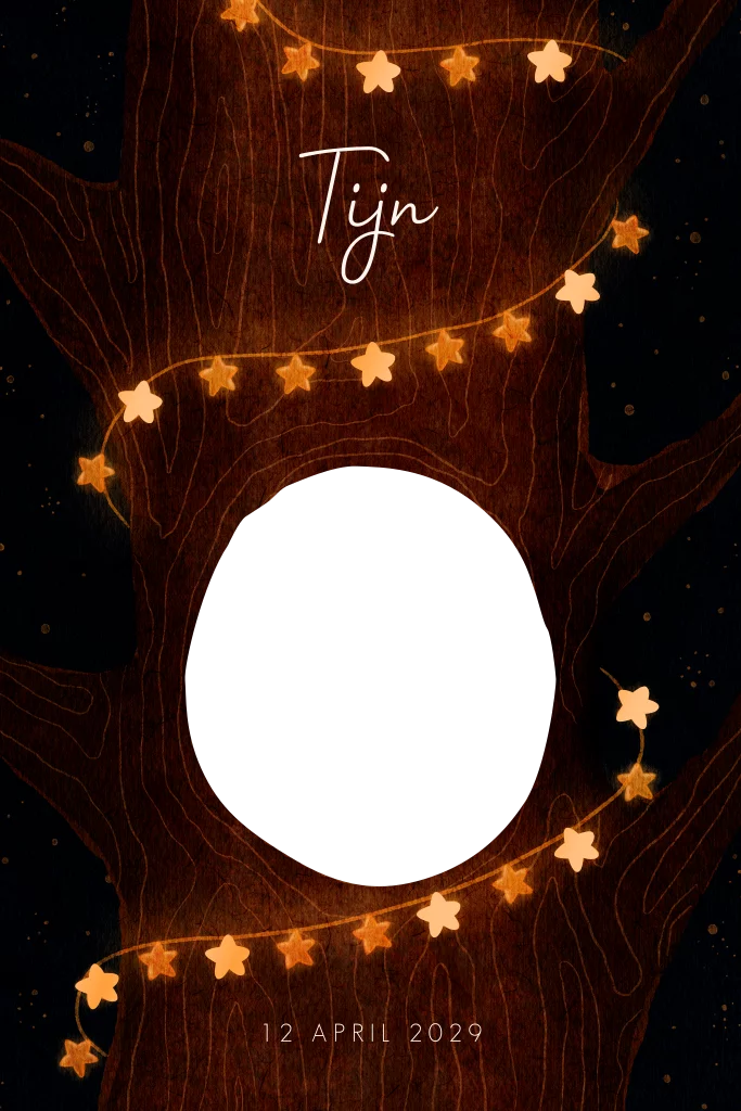 Schitterend geboortekaartje voor een jongen met uitsnede aan de voorkant. De uitsnede lijkt op de holling van een boom waarin je een eekhoorn mama ziet met haar eekhoorn baby. Dit babykaartje Tijn is voorzien van spot uv lak, wat een exclusieve uitstraling geeft. De warme kleuren en lampenslinger van sterren geven een sfeervol geheel. Teksten en kleuren pas je eenvoudig aan in onze ontwerpmodule. Vragen? Bel, mail of chat ons gerust!