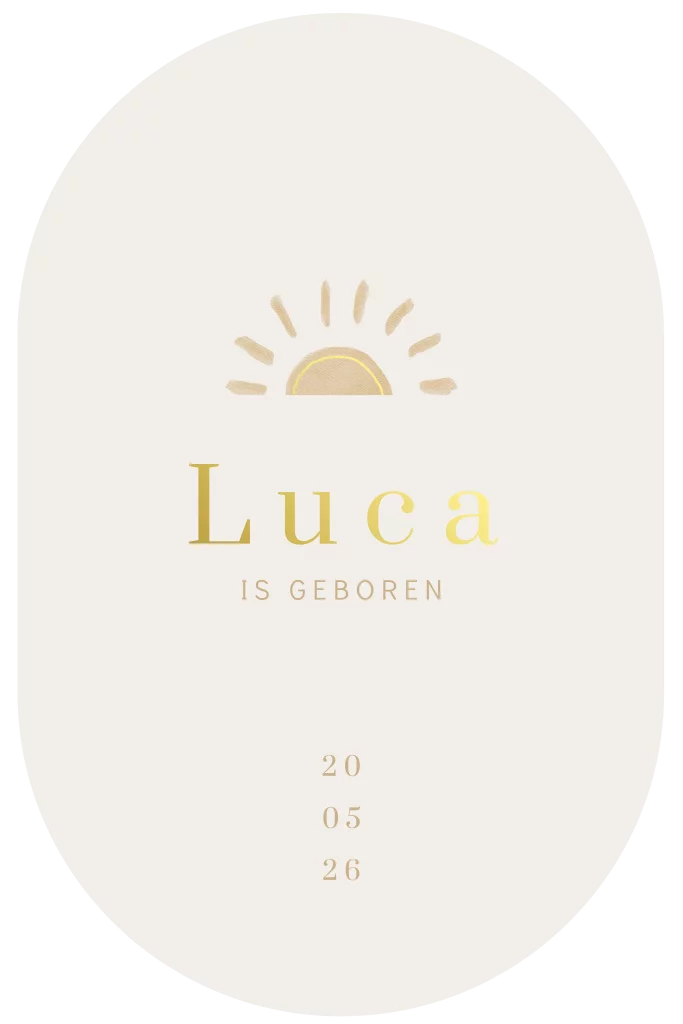 Origineel geboortekaartje in bijzondere vorm speciaal voor een jongen. Dit babykaartje heeft een rustige uitstraling en is gesneden in de vorm van een ovaal. Op dit jongenskaartje Luca een beige achtergrond met een zon. De goudfolie geeft dit kaartje een exclusieve uitstraling.