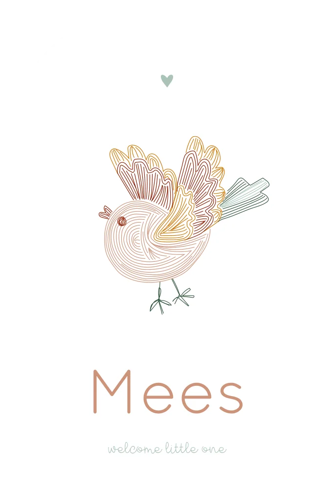 Dit geboortekaartje Mees is een ontwerp van Jollein® uit de Lovely birds collectie en is speciaal in samenwerking met Jollein® ontworpen. Alle designelementen staan daarom vast waardoor het ontwerp zelf niet aanpasbaar is. Je kunt de teksten uiteraard wel gemakkelijk aanpassen in de editor.