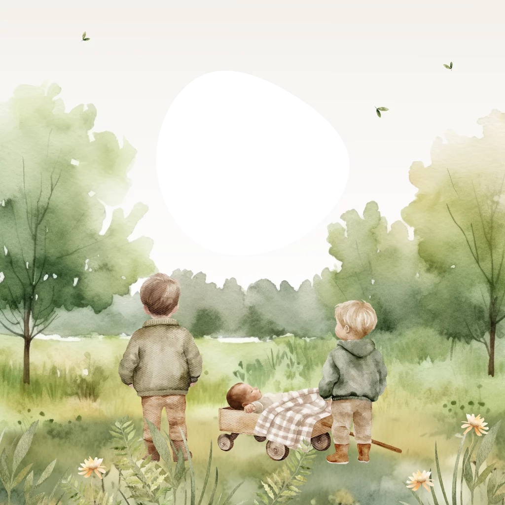 Dit prachtige geboortekaartje met een aquarel tekening is perfect voor ouders die op zoek zijn naar een geboortekaartje voor hun derde kindje. Dit geboortekaartje is ideaal voor gezinnen met twee broers die de komst van hun nieuwe baby broertje willen vieren. Het geboortekaartje heeft een mooie uitsnede waardoor je op de voorkant met een doorkijkje de naam van het kindje in goudfolie gedrukt ziet op de binnenzijde van de kaart. Het is een fantastisch doorkijkje met een organische vorm naar de binnenkant van de kaart met een luxe uitstraling door het goudfolie. Je ziet twee broers samen bij een kar staan waar hun baby broertje in ligt. Ze staan in een geschilderd bos met een paar bloemen op de voorgrond.