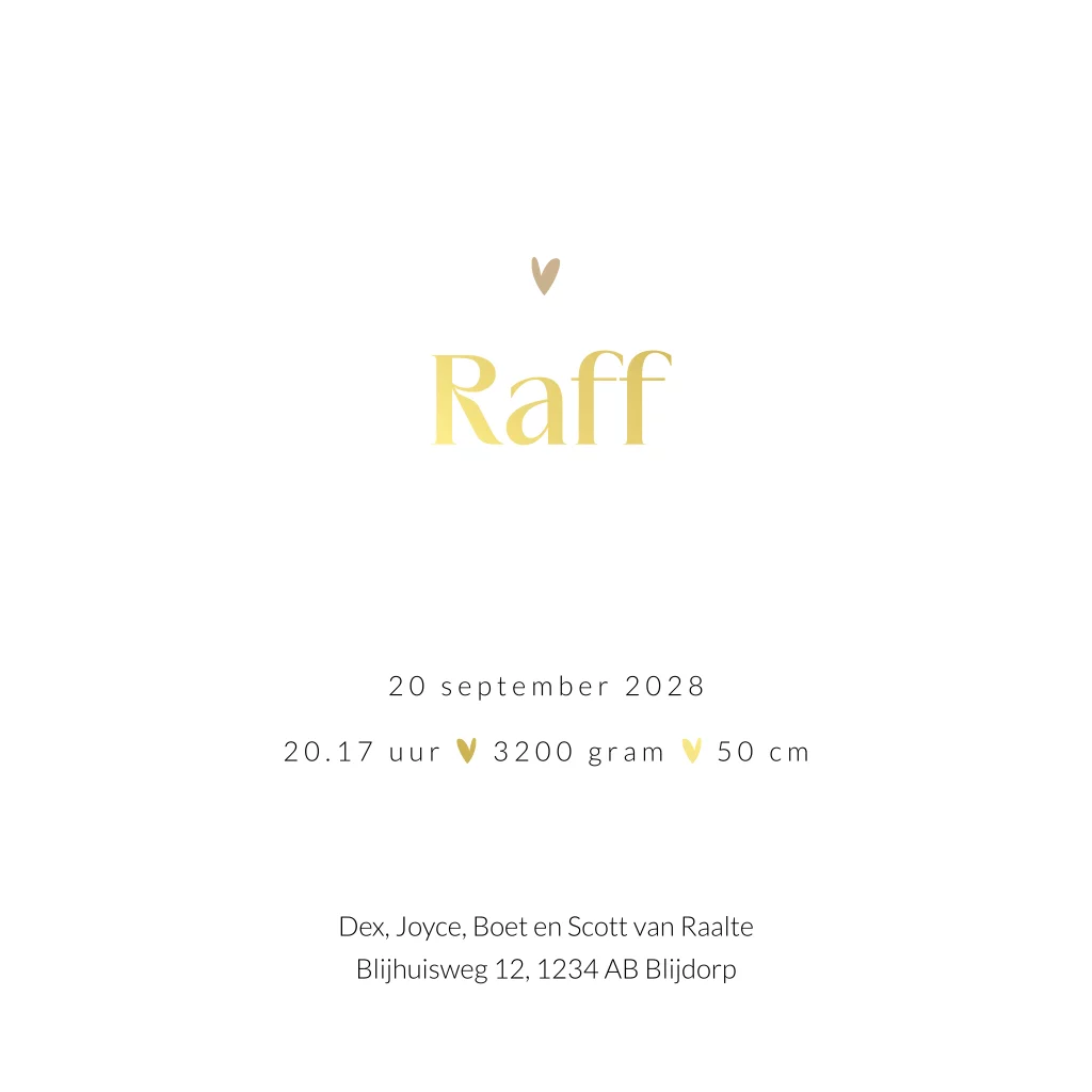 Pas dit geboortekaartje Raff eenvoudig aan in de editor. Dit kaartje is ook mogelijk in een andere gezinssamenstelling.