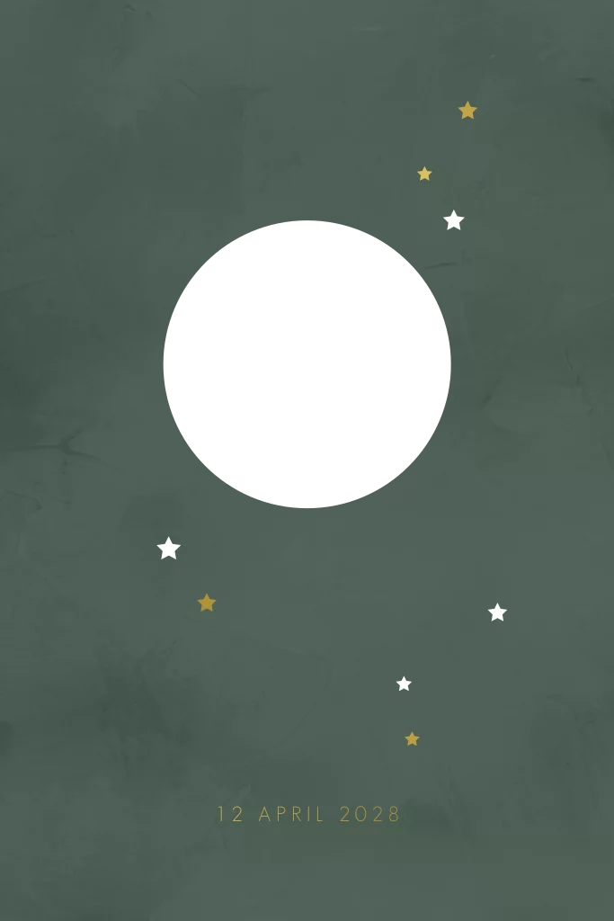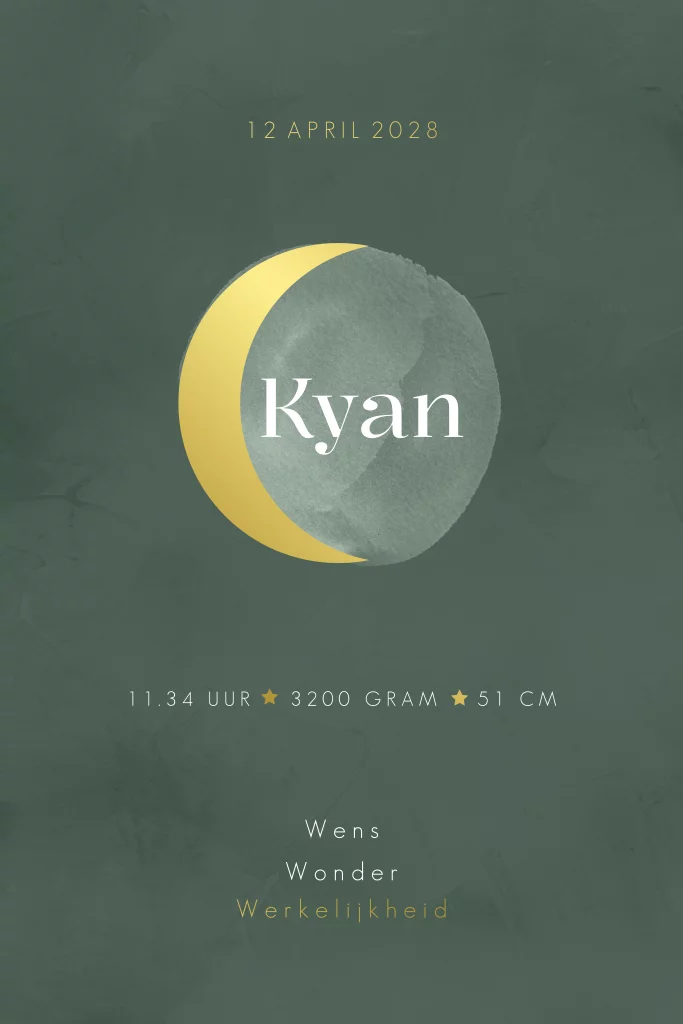 Schittterend geboortekaartje voor een jongen met ronde uitsnede aan de voorkant, waardoor je een maan ziet. Dit babykaartje Kyan is voorzien van goudfolie, wat een exclusieve uitstraling geeft. De goudfolie van de sterren en de maan, in combinatie met de donkergroene achtergrond, geeft een sfeervol geheel. Teksten en (folie)kleuren pas je eenvoudig aan in onze ontwerpmodule. Vragen? Bel, mail of chat ons gerust!