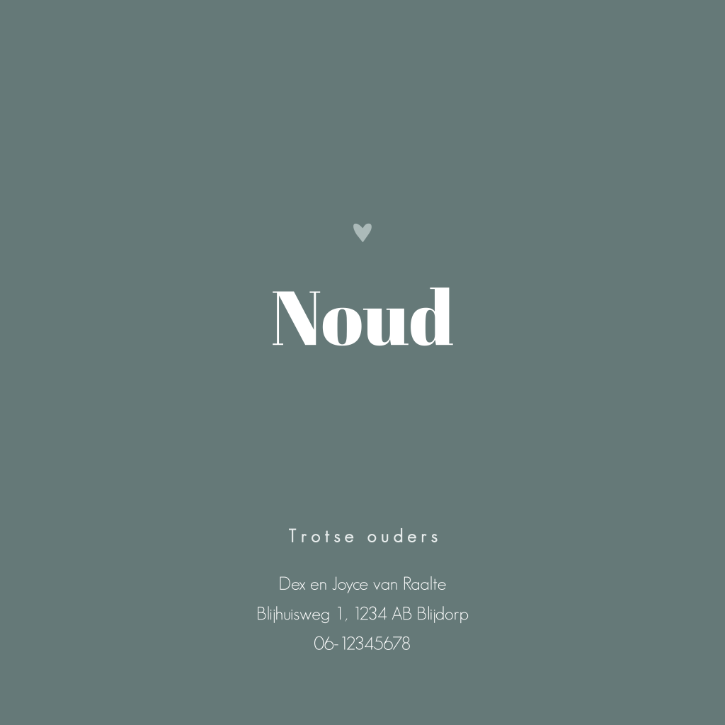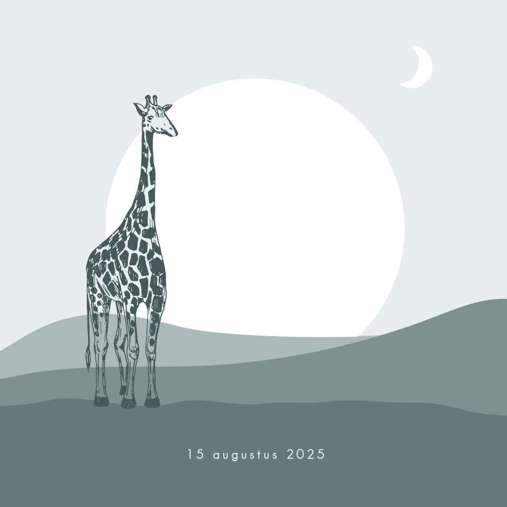 Geboortekaartje in safari stijl voor een jongen, jullie zoon! Op dit babykaartje Noud een giraf in een glooiend landschap. Uniek aan dit kaartje is de uitsnede van de ondergaande zon. De maan en het hartje maken het jongenskaartje helemaal af. Liever een ander tekst, kleur of lettertype? Dit pas je eenvoudig aan in onze editor.