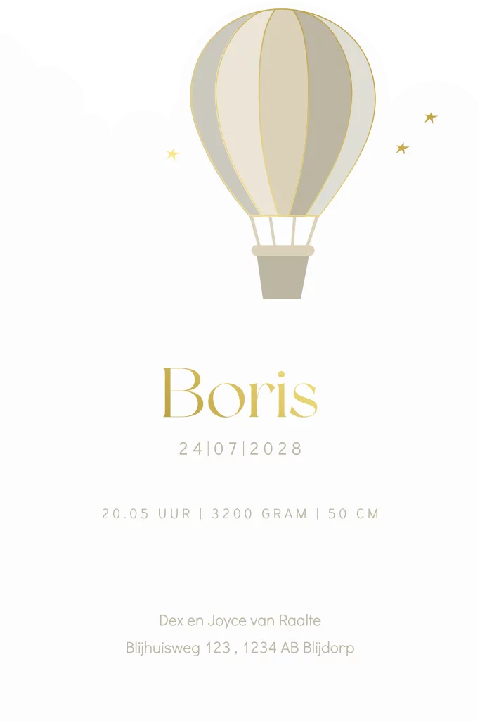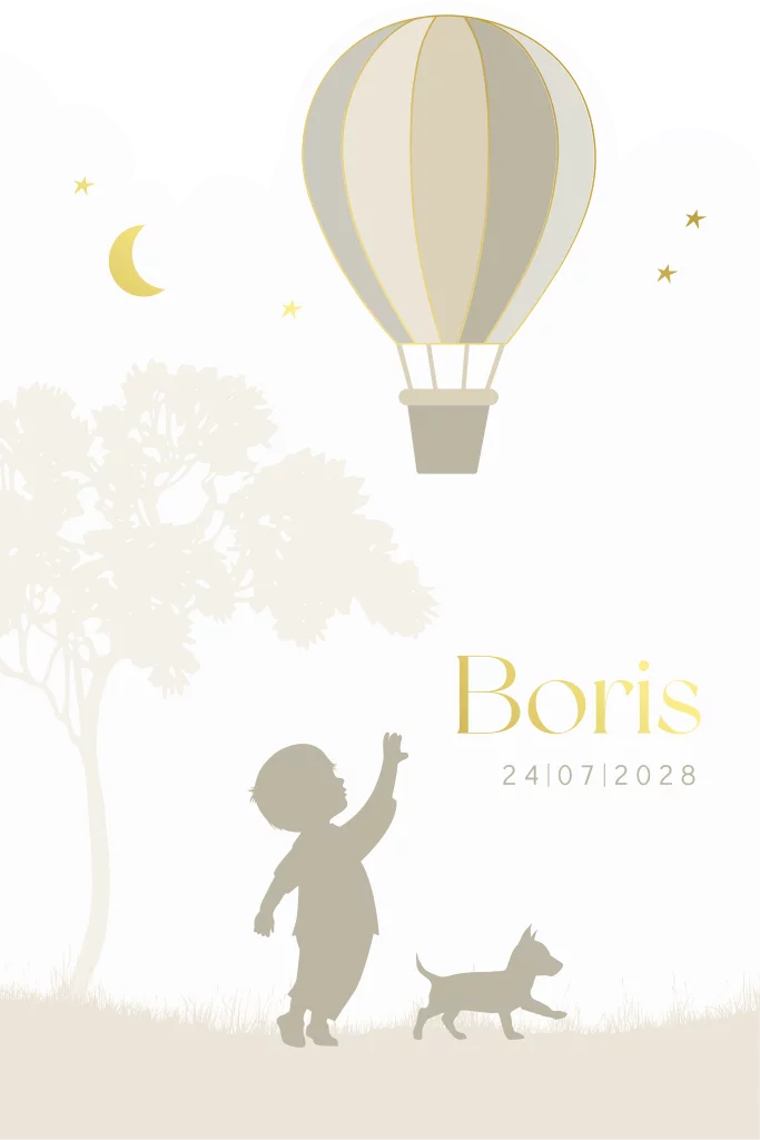 Een uniek jongens geboortekaartje Boris met een silhouet van een jongentje en een hondje. Deze kaart heeft een unieke vorm met bovenaan de kaart een uitsnede van een luchtballon en wolken. Het jongetje wijst naar de luchtballon en het hondje rent voor het jongetje uit. Verder zie je een boom, de maan en de sterren. Dit kaartje Boris heeft goud foliedruk wat zorgt voor een extra luxe uitstraling. Pas het kaartje voor jullie zoon naar eigen wens aan in de online editor.