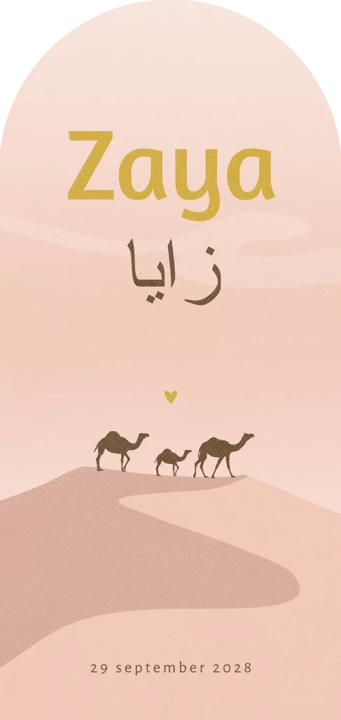 Dit prachtige Arabische geboortekaartje in de vorm van een boog is perfect voor de aankondiging van de geboorte van jullie meisje. Op deze kaart met de babynaam Zaya zie je een roze ton sur ton woestijn landschap met een kamelen familie. De combinatie van de aparte vorm, de rustige illustratie en de zachte roze kleuren geven dit islamitische geboortekaartje een hippe en elegante uitstraling. De oudroze envelop met gouden inlay maakt het geheel helemaal af en zorgt voor een extra vleugje luxe.