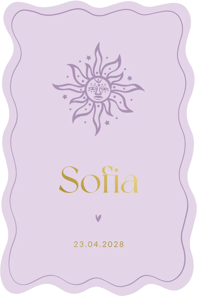 Dit unieke geboortekaartje voor een meisje is een ware eyecatcher. De aparte vorm van golven zorgt voor een speels en bijzonder effect. De paarse kleuren en zon zorgen voor een kleurrijk en origineel geheel. De toevoeging van prachtige foliedruk geeft het kaartje een extra luxe uitstraling.