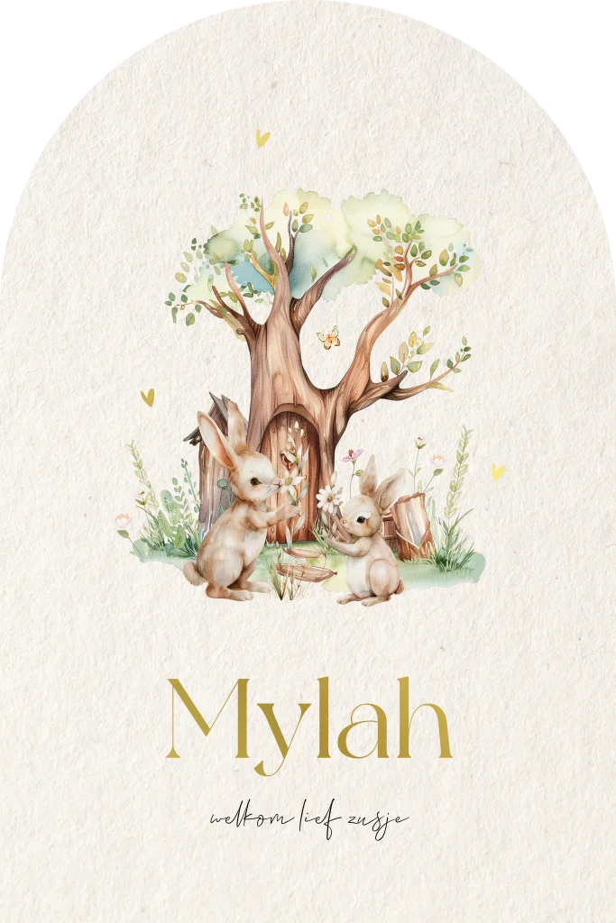 Prachtig geïllustreerd geboortekaartje in een boogvorm voor een meisje. Op dit geboortekaartje Mylah zie je twee schattige konijntjes die bloemen aan elkaar geven. Achter de konijntjes zie je een boom met een deurtje. Dit geboortekaartje heeft zowel op de voorzijde als op de achterzijde van de kaart goudfolie. Foliedruk geeft een extra luxe uitstraling aan dit geboortekaartje. Bestel dit prachtige geboortekaartje en deel jullie vreugdevolle nieuws op een unieke en persoonlijke manier.