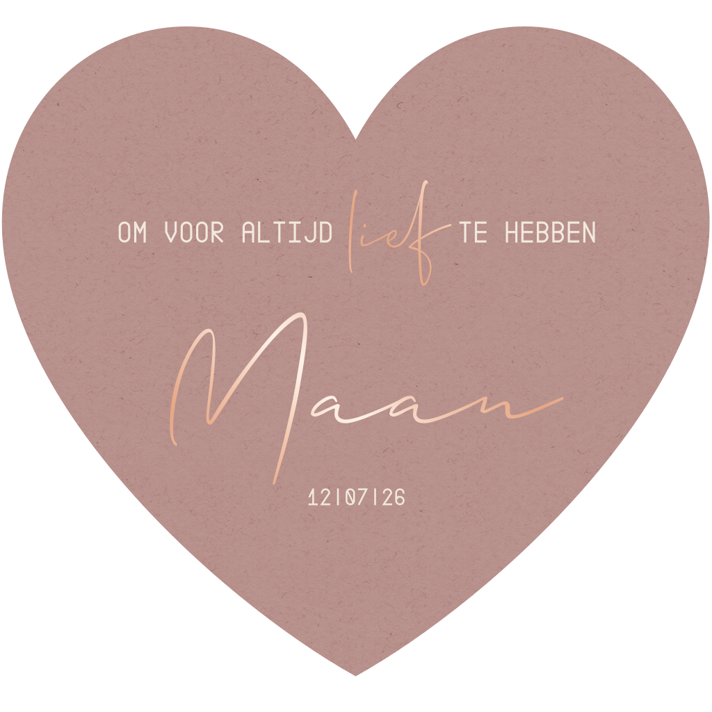 Schitterend roséfolie geboortekaartje voor een meisje. Dit geboortekaartje Maan is gesneden in de vorm van een hart. Superlief toch? Op deze babykaart voor een dochter, een mooie combinatie van handgeschreven en strakke lettertypes voor een kartonlook achtergrond in een trendy oudroze kleur. Andere teksten, lettertypes of (folie)kleuren? Dit pas je eenvoudig aan in onze editor.