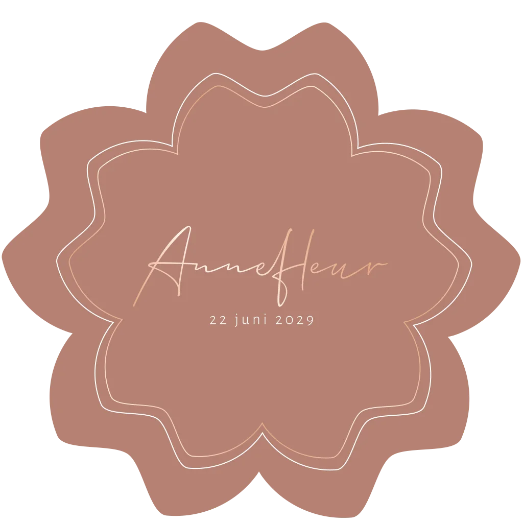 Fleurig meisjes geboortekaartje in bijzondere vorm. Dit babykaartje is gesneden in de vorm van een bloem. Met een dubbel bloemen kader en de achtergrond in een trendy aardetint. Dit kaartje Annefleur is voorzien van roséfolie, wat de kaart net een tikje exclusiever maakt. De kleur van de foliebedrukking kun je in de ontwerpmodule aanpassen.