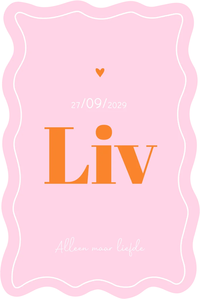 Dit prachtige roze geboortekaartje Liv is een unieke keuze voor de aankondiging van de geboorte van jullie dochtertje. Het kaartje heeft een aparte vorm, namelijk een uitsnede van golven. De naam staat in een felle oranje kleur op het kaartje, dit geeft een mooi contrast met de lichtroze achtergrond. Pas de kleuren makkelijk zelf aan in de online editor.