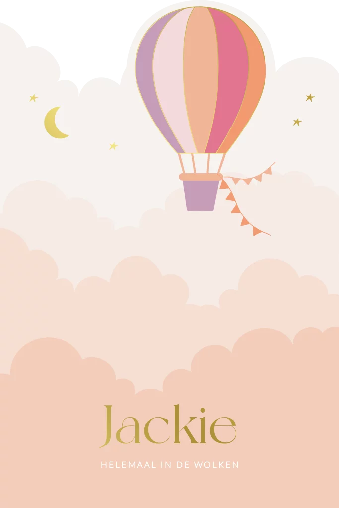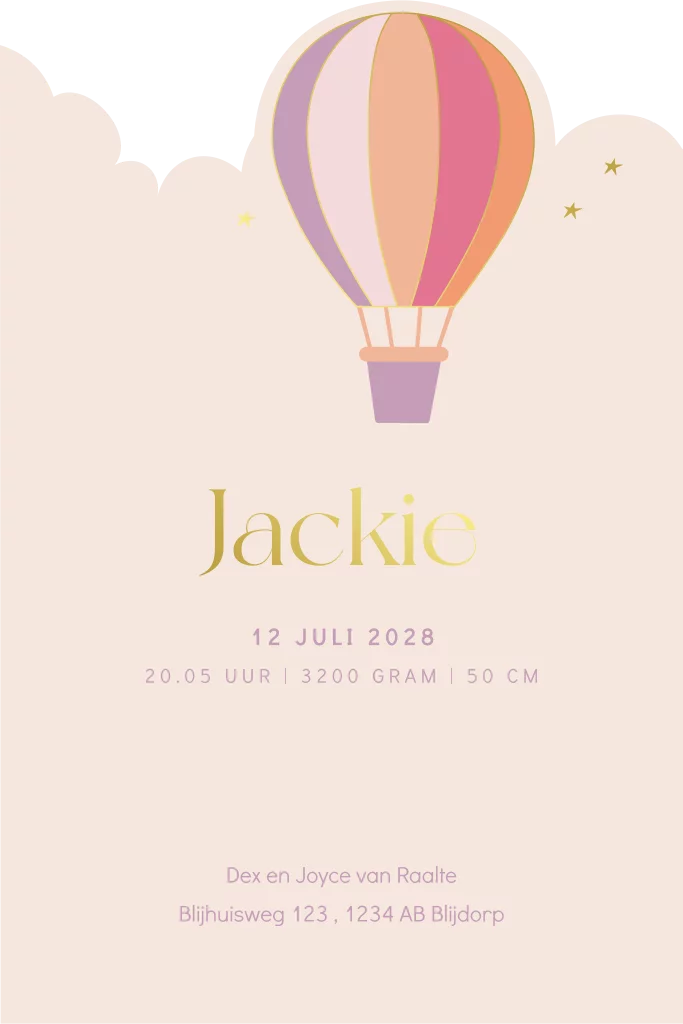 Op zoek naar een uniek geboortekaartje voor jullie meisje? Ontdek dit prachtige geboortekaartje Jackie met een unieke vorm! De bovenkant van de kaart is in de vorm van een luchtballon en wolken ontworpen wat doorgetrokken is naar de achterkaart. Je ziet een schattig tafereel op dit geboortekaartje van roze wolken en een luchtballon die in de lucht zweeft met slingers aan het mandje vast. Ook is er goudfolie op deze kaart verwerkt voor een extra luxe uitstraling. Teksten en kleuren zijn eenvoudig aan te passen in de editor. Met de bijpassende sluitzegel en envelop maak je het geboortekaartje helemaal af.