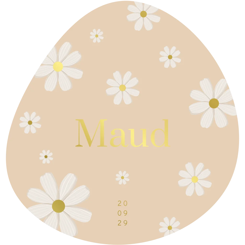 Origineel geboortekaartje voor een meisje in organische kiezel vorm. Op dit luxe meisjeskaartje Maud een patroon van bloemetjes, madeliefjes, met goudfolie. De achtergrond heeft een lichte perzik roze kleur. De naam van jullie dochter wordt gedrukt in écht goudfolie. Dit is een luxe afwerking wat een extra touch geeft aan je kaartje. Pas de kleuren, teksten en lettertypes geheel naar eigen smaak aan in de editor.