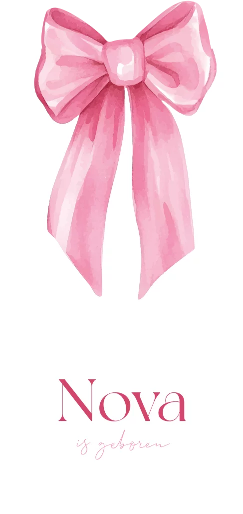 Geboortekaartje voor een meisje in aparte vorm. Op dit geboortekaartje Nova steekt de roze strik uit waardoor het kaartje een aparte vorm heeft. De roze kleur steekt mooi af tegen de witte achtergrond. Je kunt dit geboortekaartje zelf gemakkelijk bewerken, opslaan en bestellen. Vragen of wensen? Laat het gerust weten, wij helpen je graag.