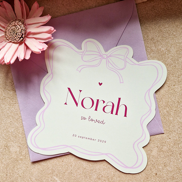 Uniek geboortekaartje voor een meisje in aparte vorm. Dit meisjes geboortekaartje Norah een golvende vorm in een knalroze neon kleur met boven aan een strik. Pas de teksten, lettertypes en kleuren eenvoudig aan in de editor. Hulp nodig bij het ontwerpen? Neem contact met ons op!