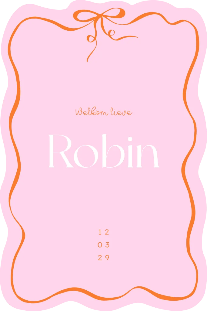 Hoe leuk en origineel is dit geboortekaartje voor een meisje! Dit geboortekaartje Robin heeft een aparte golvende vorm met een kader en strikje. De achtergrond heeft een felle roze kleur. Pas teksten en kleuren aan in onze online editor voor jullie persoonlijke touch.