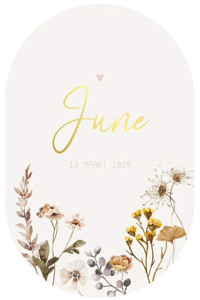 Luxe geboortekaartje voor een meisje in een aparte vorm. Dit romantische babykaartje June heeft prachtige aquarel bloemen, wildbloemen, en is gesneden in een ovale vorm. De naam van jullie dochter wordt gedrukt in echt goudfolie. Dit maakt de kaart nóg exclusiever. Kleuren en lettertypes kun je aanpassen in de editor. Hulp nodig? Mail, chat of bel ons gerust.