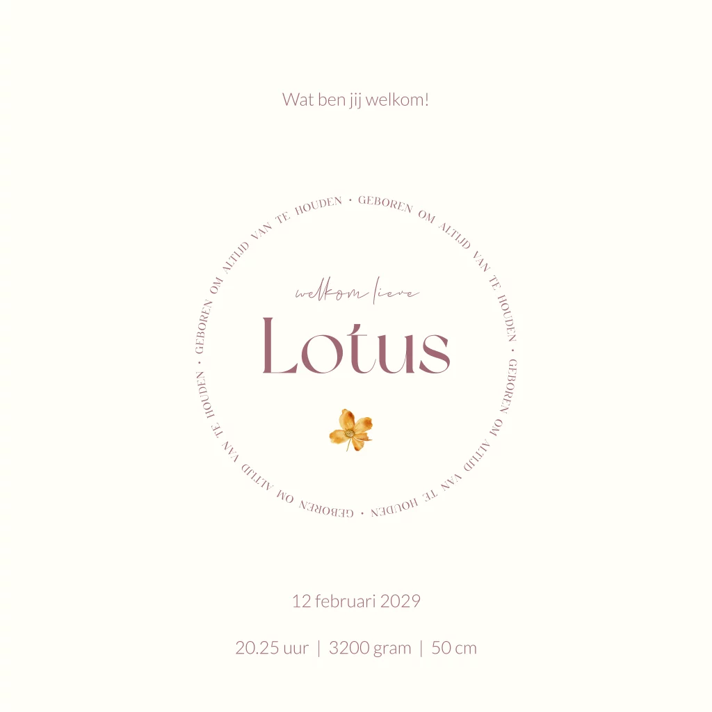 Prachtig geboortekaartje met aquarel bloemetjes en hartjes. Dit geboortekaartje Lotus heeft een uitsnede waardoor je naar de binnenkant van het kaartje kunt kijken, een super speciaal effect! De achtergrond heeft een beige tint waardoor de bloemetjes goed opvallen, een echt lente geboortekaartje!