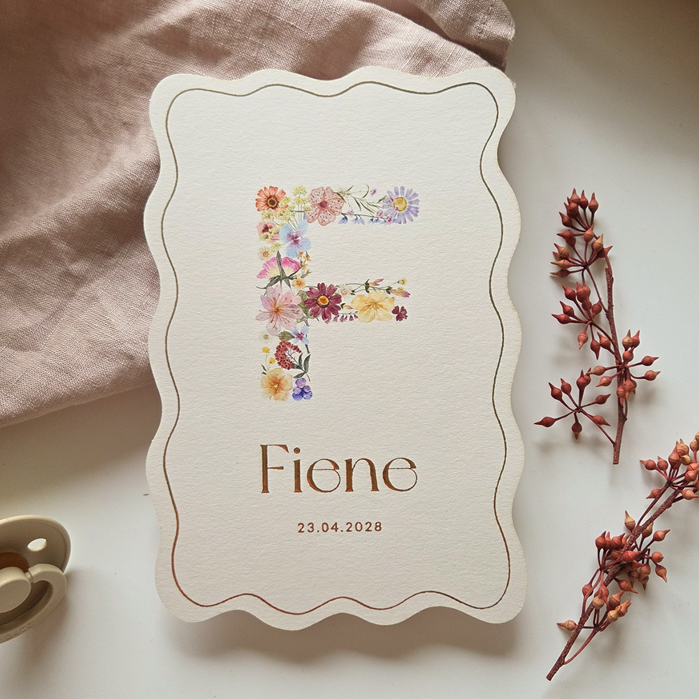 Dit unieke geboortekaartje Fiene voor een meisje is een ware eyecatcher. De aparte vorm van golven zorgt voor een speels en bijzonder effect. De letter met de kleurrijke bloemen zorgt voor een stijlvol effect. Dit geboortekaartje voor jullie dochter is naar eigen wens aan te passen in de online editor. Zoek bij de illustraties de juiste letter uit van de voornaam van jullie kindje. De toevoeging van prachtige goudfolie geeft het kaartje een extra luxe uitstraling.