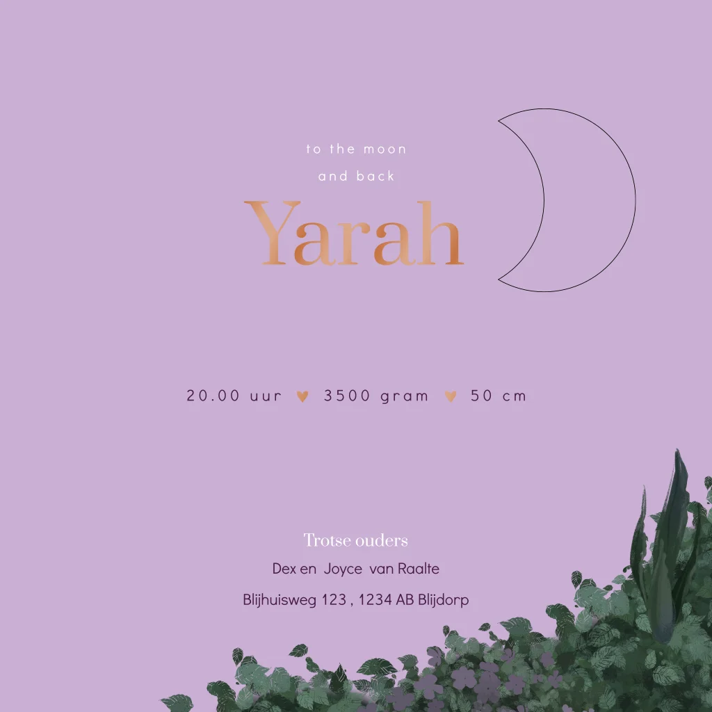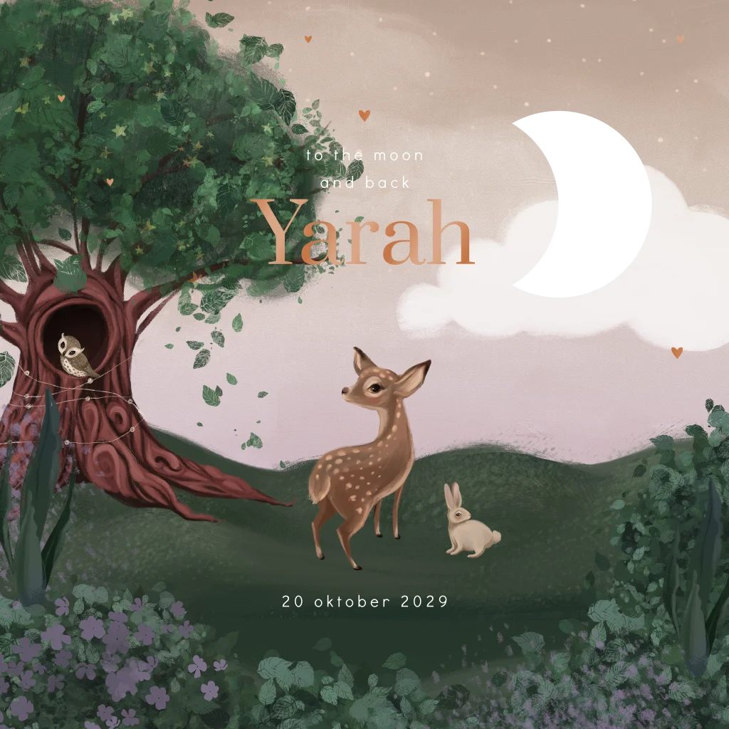 Wat een sprookje, dit geboortekaartje met uitsnede van een maan. Op dit meisjeskaartje Yarah een groen heuvellandschap met een uil in een versierde boom, bloemen en een lief hertje met konijntje. Op de achtergrond een mooie roze lucht met maan en hartjes als sterren. De maan geeft een doorkijkje naar de binnenkant van de kaart. Dat geeft dit geboortekaartje, samen met de hoogglans bedrukking, een unieke luxe uitstraling.