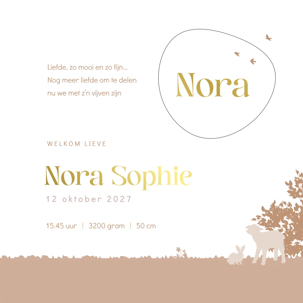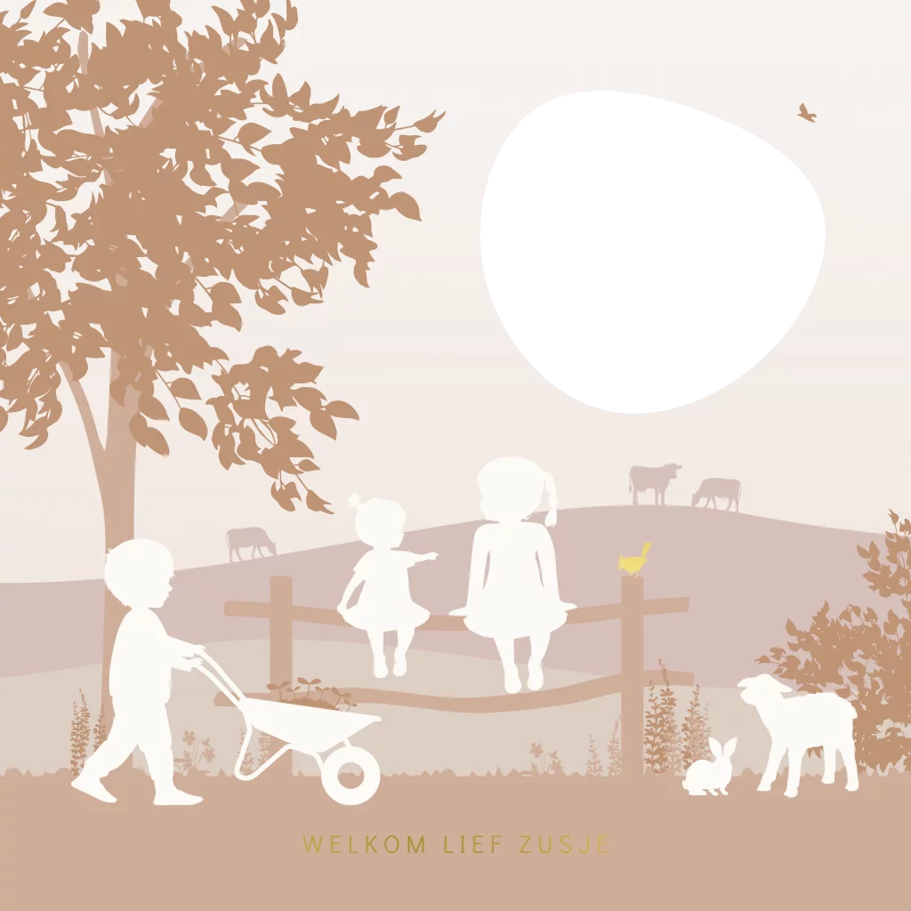 Uniek geboortekaartje voor een derde kindje, een zusje! Op dit geboortekaartje zie je een ton sur ton landschap met boerderij dieren waaronder een koe en lammetjes. Grote zus en het kleine zusje zitten op een hekje. De grote broer loopt met een kruiwagen. Bijzonder aan dit geboortekaartje Nora zijn de speciale kenmerken zoals de uitsnede in organische vorm wat een doorkijkje geeft naar de binnenkant van de kaart. Daarnaast is de kaart voorzien van ronde hoeken en gouden folie, dit geeft een extra luxe en hippe uitstraling aan dit prachtige originele geboortekaartje voor een meisje.