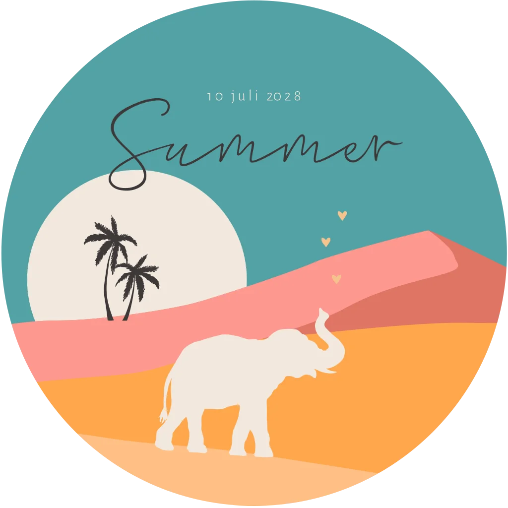 Kleurrijk geboortekaartje voor een meisje in bijzondere vorm. Dit babykaartje Summer is gesneden in een ronde vorm. Op deze kaart met safari thema een silhouet van een olifantje die hartjes uitblaast, palmbomen én een zon, voor een lekker zomers sfeertje!