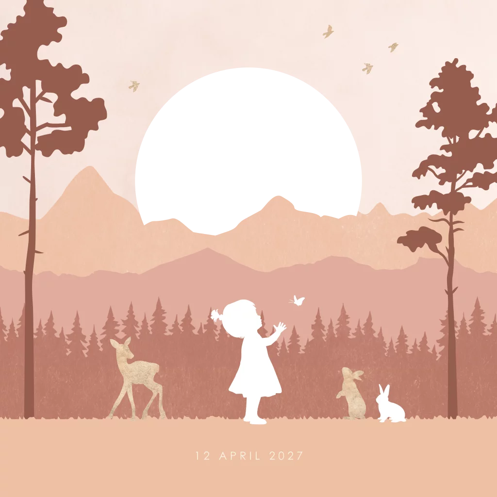 Zoek je een uniek geboortekaartje voor je meisje? Kies dan voor dit prachtige roze silhouetkaartje met uitsnede. Op dit geboortekaartje Riva zie je een silhouetje van een meisje met bosdieren waaronder een hertje en konijn. Op de achtergrond een ton sur ton roze bergsilhouet met bomen. Dit geboortekaartje is een echte eye-catcher dankzij de aparte uitsnede van een zon, waardoor je een glimp opvangt van de binnenkant van de kaart. Teksten en kleuren pas je samen met de gezinssamenstelling eenvoudig aan in onze ontwerpmodule. Vragen? Bel, mail of chat ons gerust!